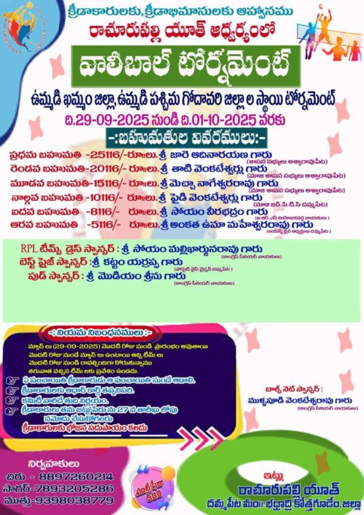 త్రినేత్రం న్యూస్. భద్రాద్రి కొత్తగూడెం జిల్లా, దమ్మపేట: దమ్మపేట మండలం రాచూరుపల్లి యూత్ ఆధ్వర్యంలో ఉమ్మడి ఖమ్మం, పశ్చిమ గోదావరి జిల్లాల స్థాయి వాలీబాల్ టోర్నమెంట్ నిర్వహించనున్నట్లు నిర్వాహకులు ప్రకటించారు. సెప్టెంబర్ 29, 2025 నుండి అక్టోబర్ 1, 2025 వరకు మూడు రోజుల పాటు భద్రాద్రి కొత్తగూడెం జిల్లా, దమ్మపేట మండలం, రాచూరుపల్లి గ్రామంలో జరిగే ఈ టోర్నమెంట్కు క్రీడాకారులతో పాటు క్రీడాభిమానులను కూడా ఆహ్వానిస్తున్నారు. టోర్నమెంట్లో పాల్గొనదలిచిన జట్లు రూ. 500/- ఎంట్రీ ఫీజు చెల్లించాల్సి ఉంటుందని నిర్వాహకులు తెలిపారు.ఆకర్షణీయమైన బహుమతులు, ప్రముఖుల స్పాన్సర్షిప్ ఈ టోర్నమెంట్లో విజేతలకు ఆకర్షణీయమైన నగదు బహుమతులను అందజేయనున్నారు. ప్రథమ బహుమతి రూ. 25,116/-ను అశ్వారావుపేట శాసనసభ్యులు జారె ఆదినారాయణ, ద్వితీయ బహుమతి రూ. 20,116/-ను అశ్వారావుపేట మాజీ శాసనసభ్యులు తాటి వెంకటేశ్వర్లు, తృతీయ బహుమతి రూ. 15,116/-ను అశ్వారావుపేట మాజీ శాసనసభ్యులు మెచ్చా నాగేశ్వరరావు అందజేయనున్నారు.