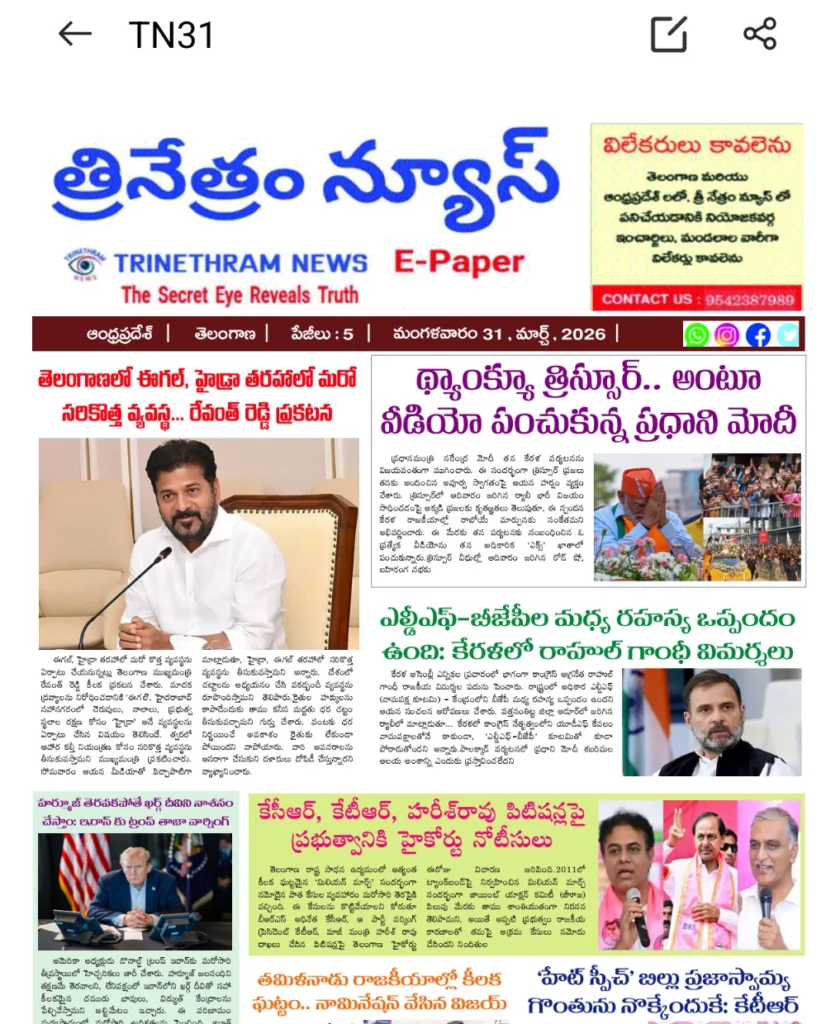 Sri Parabhava Nama Year : త్రినేత్రం న్యూస్ : శ్రీ గురుభ్యోనమః మంగళవారం,మార్చి.31,2026శ్రీ పరాభవ నామ సంవత్సరంఉత్తరాయనం – వసంత ఋతువుచైత్ర మాసం – శుక్ల