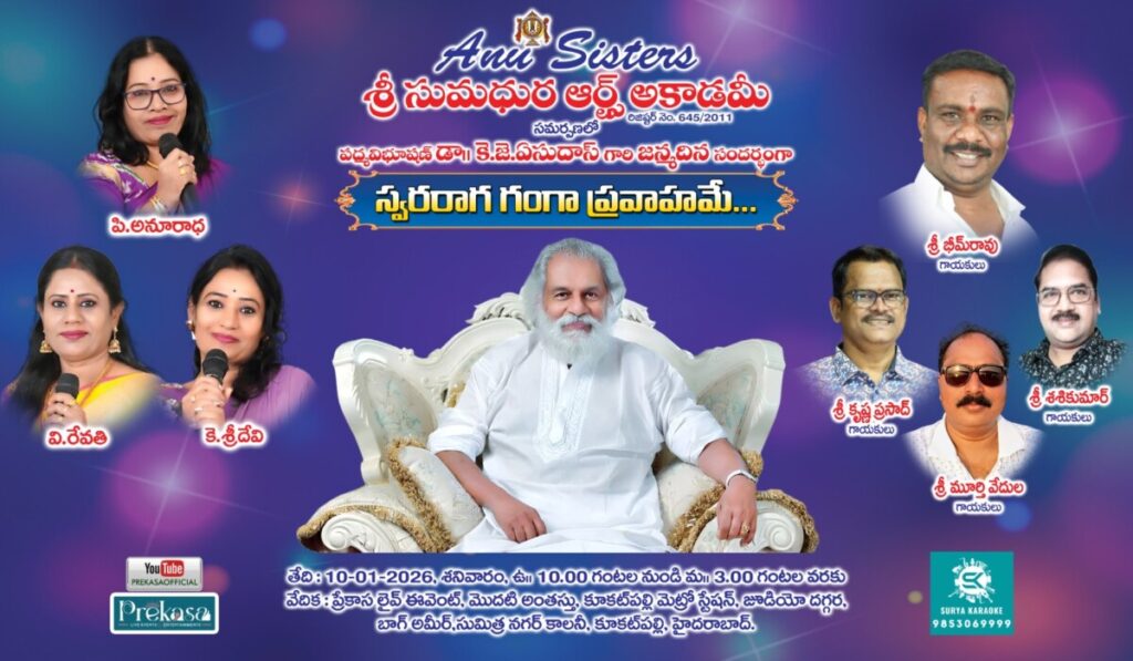 కూకట్పల్లి జనవరి 11 (త్రినేత్రం న్యూస్) : ప్రముఖ గాయకుడు, గానగంధర్వుడు కె.జె. ఏసుదాసు జన్మదినాన్ని పురస్కరించుకుని శనివారం కూకట్పల్లిలో నిర్వహించిన ‘స్వరరాగ గంగా ప్రవాహమే’ పాటల