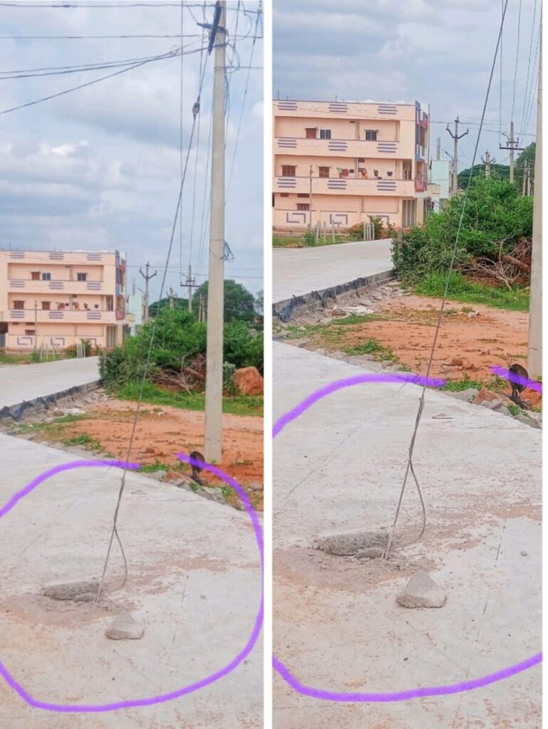 రోడ్డుకు అడ్డంగా విద్యుత్ తీగ ఉన్న పట్టించుకోని కాంట్రాక్టర్, మరియు విద్యుత్ శాఖ సిబ్బంది.చీకట్లో విద్యుత్ తీగ (ఎర్త్) కనబడక ప్రజలకు బాటసారులకు, వాహనాదారులకు ప్రమాదాలు జరిగితే,