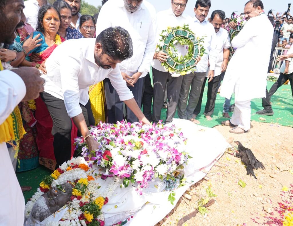 వికారాబాద్ జిల్లా ప్రతినిధి త్రినేత్రం న్యూస్ : తెలంగాణ రాష్ట్ర గీత రచయిత అందెశ్రీ పార్థివ దేహాన్ని సందర్శించి ముఖ్యమంత్రి ఎ. రేవంత్ రెడ్డి వారికి నివాళులర్పించారు.