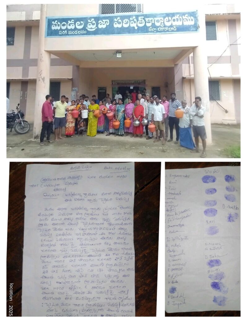 వికారాబాద్ జిల్లా ప్రతినిధి త్రినేత్రం న్యూస్: నీళ్ల కోసం పరిగి MPDO ఆఫీసు ముందు బైఠాయించిన బర్కత్ పల్లి గ్రామస్థులు. గ్రామస్థుల వినతి పత్రం తీసుకునే అధికారులు